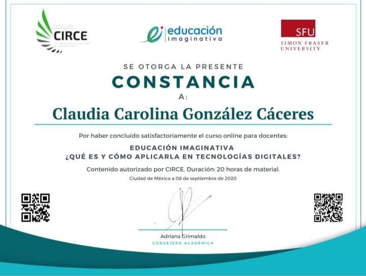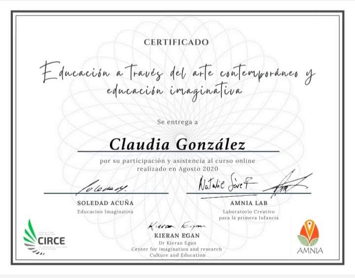 Con fecha 2020, nuestra Docente ha obtenido Certificación Internacional en Educación Imaginativa (uno de los 5 pilares de nuestra Metodología Holística CREAunECO®); emitido por el Centre for Imagination in Research Culture & Education CIRCE Canadá, Educación Imaginativa Chile y México.